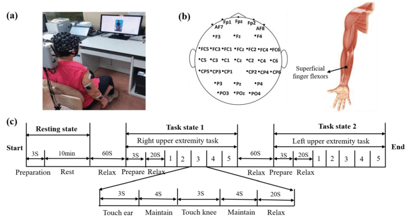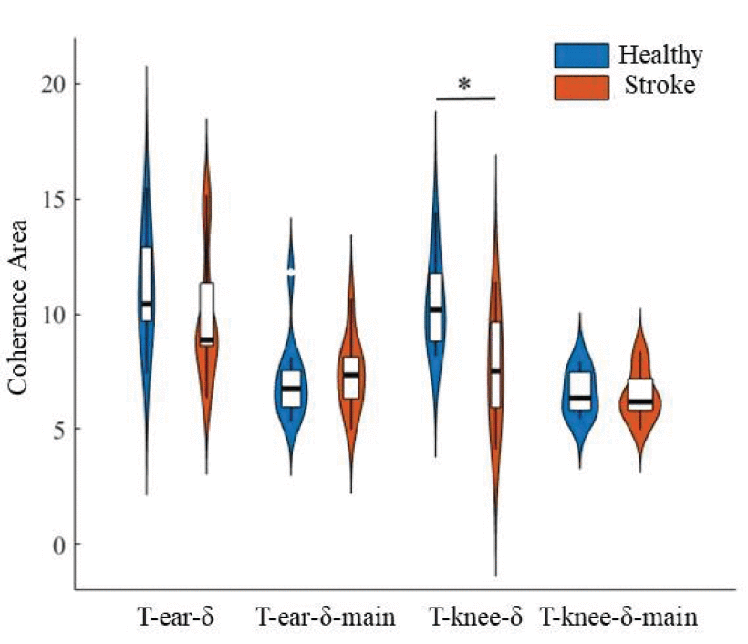 运动控制是神经、运动和感觉功能之间协调和信息交互的复杂过程。研究运动-生理信息之间的相关性有助于了解人类的运动控制机制,对评估运动功能状态具有重要意义。在本手稿中,我们研究了健康对照组和脑卒中患者在不同运动中神经运动耦合分析的差异。我们在脑电图(EEG)和加速度(ACC)数据之间应用了皮质运动学相干(CKC)函数。首先,我们收集了 10 名健康对照组和 10 名脑卒中患者在动作执行(触耳和触膝)和动作维持(触耳和触膝)任务下的脑电图和加速度(ACC)数据。在对原始数据进行预处理后,我们使用频域相干法对全频脑电图和 ACC 数据进行了分析,结果表明,运动执行时的 CKC 强度高于运动维持时的 CKC 强度。然而,健康受试者与脑卒中患者之间并无明显差异。其次,局部频段的相干性结果显示,低频段更能反映运动执行和运动维持之间的差异。健康受试者的相干强度明显高于其他频段,而脑卒中患者则不然。进一步比较局部频段的一致性结果显示,健康对照组的θ频段强度明显高于其他节律,尤其是在触膝阶段。因此,我们推断,基于脑电图和 ACC 数据的神经动力耦合分析可以显示健康受试者和脑卒中患者之间的差异。此类研究可加深对神经运动控制机制的理解,并为运动功能评估提供新的量化指标。