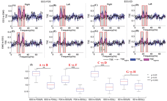 人类的手部运动被证实具有不对称性和偏侧性,两个半球在控制手部运动方面做出了一些不同但互补的贡献。然而,关于左右手运动时运动系统的信息传递是否不同的研究却很少。考虑到运动皮层和对侧肌肉之间的皮质肌肉功能耦合(FCMC)在运动评估中的重要性,本研究旨在通过研究肌肉和大脑活动之间的相互作用来探索左右手之间的差异。在此,我们应用传递谱熵算法(TSE)量化了在抓握任务中同时记录的大脑头皮脑电图(EEG)与趾外伸肌(ED)和趾外屈肌(FDS)肌电图(EMG)之间的联系。八名健康受试者参加了这项研究。结果显示,与右手相比,左手产生的贝塔同步更窄、更低。进一步分析表明,EEG-EMG(FDS)组合在贝塔波段的耦合强度高于 EEG-EMG(ED)组合,并且在下降(EEG 至 EMG 方向)和上升(EMG 至 EEG 方向)方向之间表现出明显差异。本研究揭示了左右手贝塔范围 FCMC 的差异,证实了贝塔同步在理解运动稳定性控制机制中的重要性。皮层-肌肉 FCMC 可作为探索左右运动系统差异的一种评估方法。