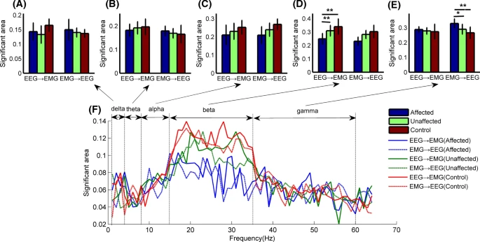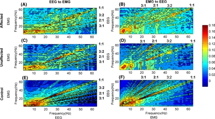 大脑和肌肉之间的功能性皮质肌肉耦合(FCMC)已被用于中风后的运动功能评估。在健康人的感觉-运动系统中存在两种类型,即同频耦合(IFC)和跨频耦合(CFC)。然而,对于脑卒中,只有少数研究关注脑电图(EEG)和肌电图(EMG)信号之间的同频耦合,还没有发现跨频耦合的研究。考虑到生物系统固有的复杂性和节律性,我们首先使用小波包变换(WPT)将脑电图和肌电信号分解为不同频段的多个子信号,然后应用传递熵(TE)分析每对子信号之间的IFC和CFC关系。本研究共纳入了 8 名脑卒中患者和 8 名健康人。结果显示,脑卒中患者的 IFC 和 CFC 仍然存在(EEG → EMG:1:1, 3:2, 2:1;EMG → EEG:1:1, 2:1, 2:3, 3:1)。与未受中风影响的一侧和健康对照组相比,受中风影响的一侧的阿尔法、贝塔和伽马同步性较低(IFC:贝塔;CFC:阿尔法、贝塔和伽马)。进一步分析表明,脑卒中患者在脑电图→肌电图和肌电图→脑电图方向上的 FCMC 没有明显差异。我们的研究表明,α和β波段对集中和维持运动能力至关重要,为了解感觉运动系统的传播和功能提供了新的视角。