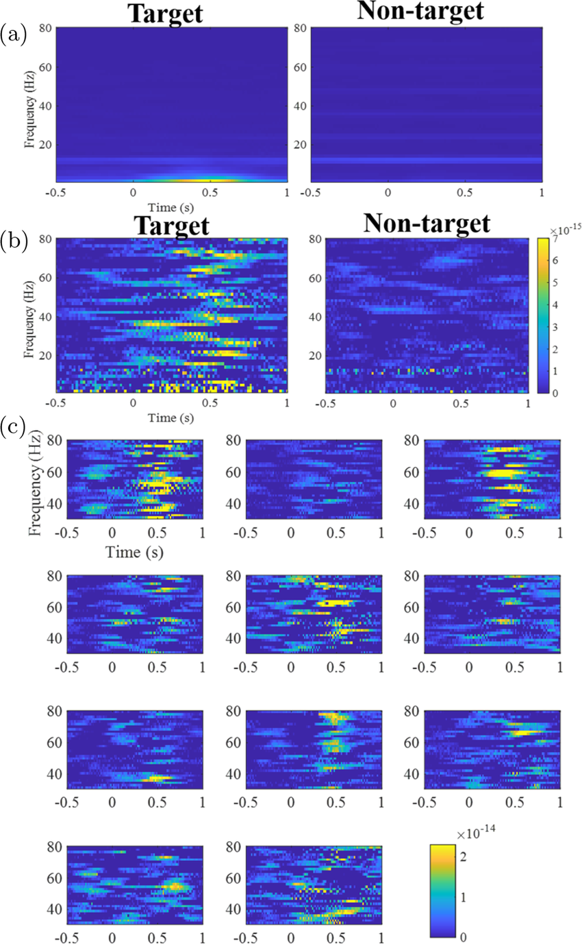 Rapid serial visual presentation (RSVP) is a type of electroencephalogram (EEG) pattern commonly used for target recognition. Besides delta- and theta-band responses already used for classification, RSVP task also evokes gamma-band responses having low amplitude and large individual difference. This paper proposes a filter bank spatio-temporal component analysis (FBSCA) method, extracting spatio-temporal features of the gamma-band responses for the first time, to enhance the RSVP classification performance. Considering the individual difference in time latency and responsive frequency, the proposed FBSCA method decomposes the gamma-band EEG data into sub-components in different time–frequency-space domains and seeks the weight coefficients to optimize the combinations of electrodes, common spatial pattern (CSP) components, time windows and frequency bands. Two state-of-the-art methods, i.e. hierarchical discriminant principal component analysis (HDPCA) and discriminative canonical pattern matching (DCPM), were used for comparison. The performance was evaluated in 10×10 cross validations using a public dataset. Study results showed that the FBSCA method outperformed the other methods regardless of number of training trials. These results suggest that the proposed FBSCA method can enhance the RSVP classification.