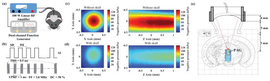 低强度聚焦超声波刺激(LIFUS)可以无创穿透完整的头骨,调节大脑皮层和深层脑核的神经活动。中脑会厌灰质(PAG)与防御行为的产生有关。本研究的目的是检测 PAG 的 LIFUS 是否会诱发小鼠的防御行为。研究人员自制了一个3.8兆赫的头戴式超声换能器,其焦点尺寸很小(0.5毫米 × 0.5毫米),可精确刺激自由移动的小鼠。相应的行为被实时记录下来。用回避、逃跑和冻结来评估超声诱导的防御反应。LIFUS的安全性通过苏木精和伊红(H&E)染色以及Nissl染色进行检验。对PAG的超声波刺激诱发了多种防御行为,包括特定位置的被动回避行为、逃跑和冻结。此外,H&E和Nissl染色证实LIFUS不会对脑组织造成任何损伤。这些研究结果表明,LIFUS可能对小鼠的先天防御行为具有神经调节作用。LIFUS可作为一种新型神经调节工具,用于治疗与防御行为相关的心理疾病。